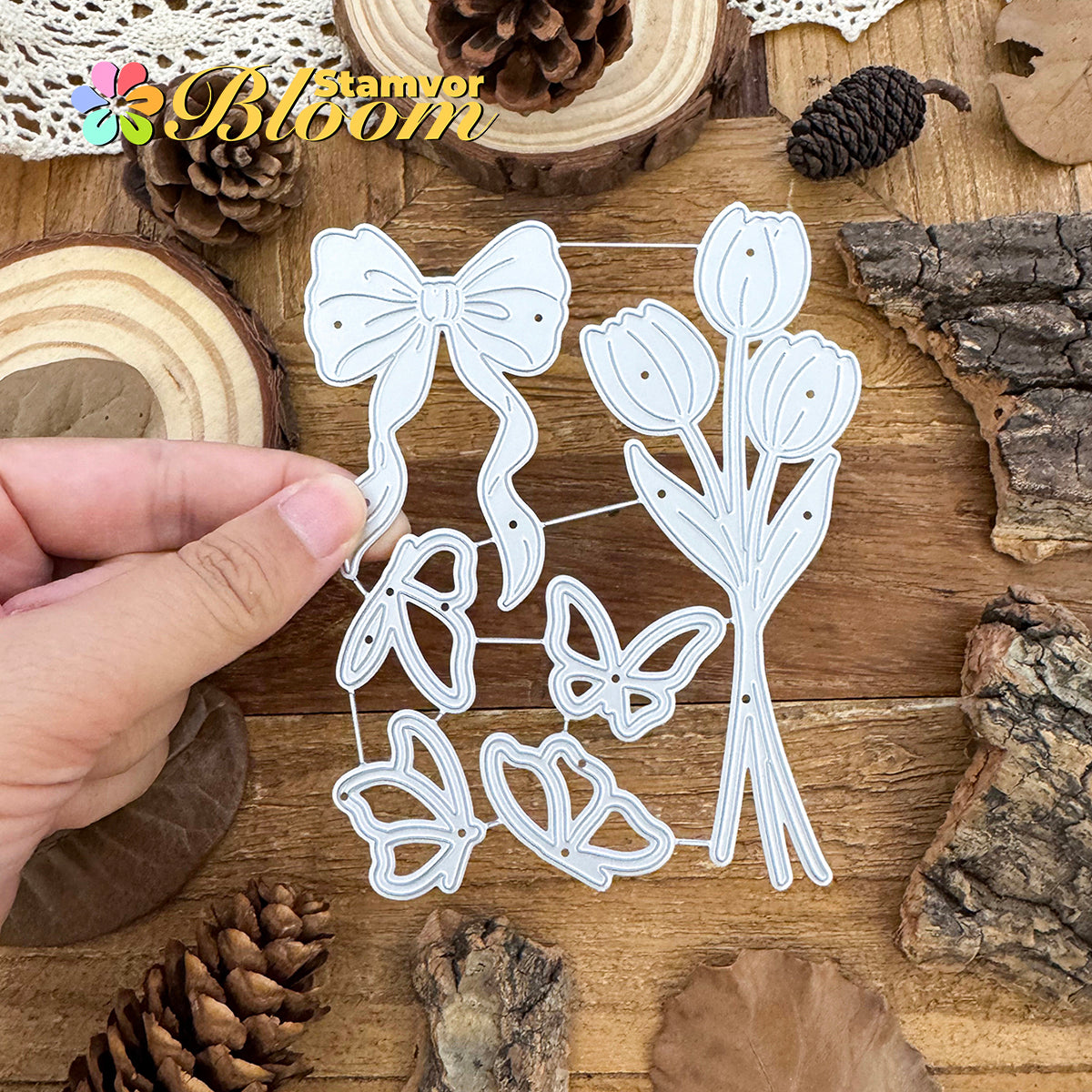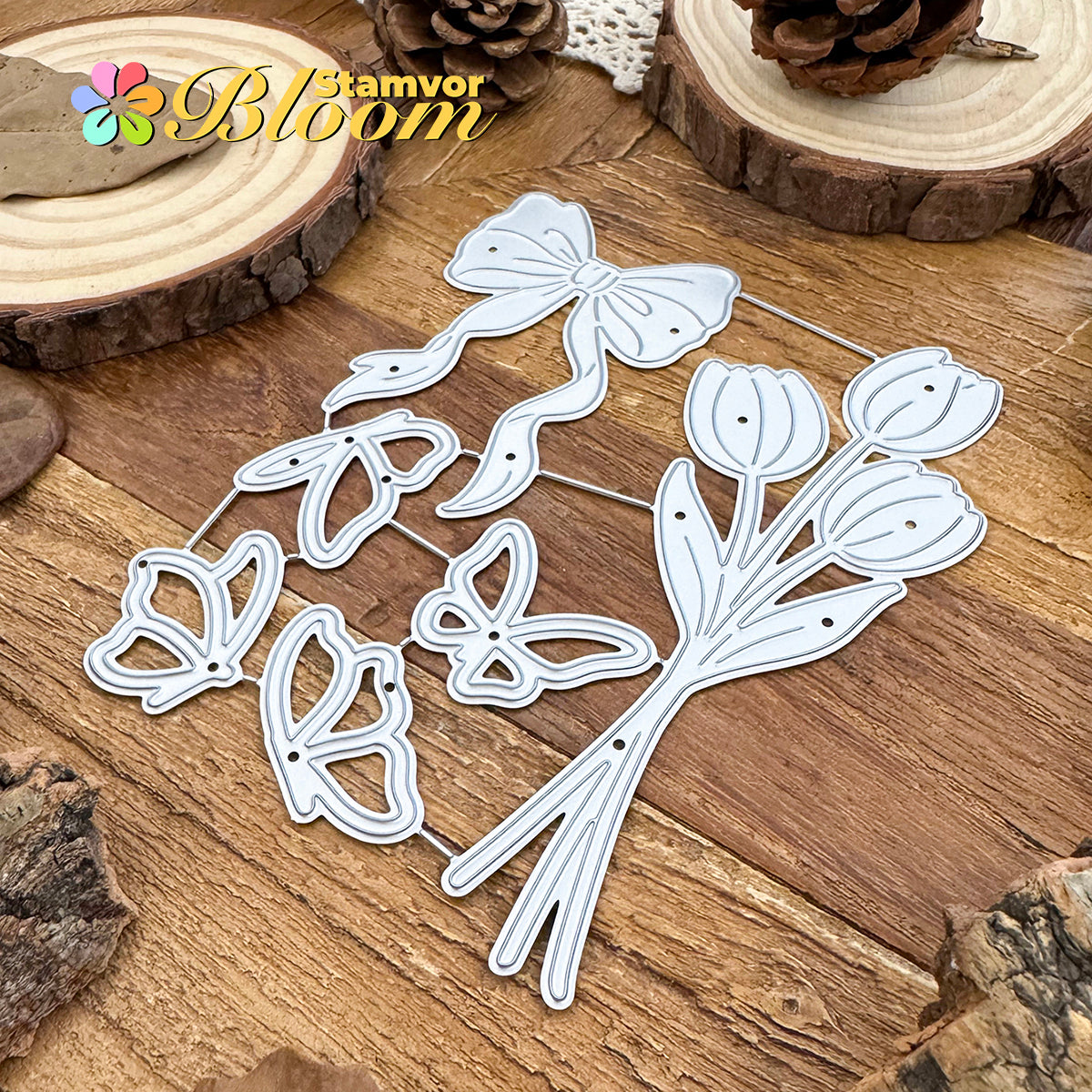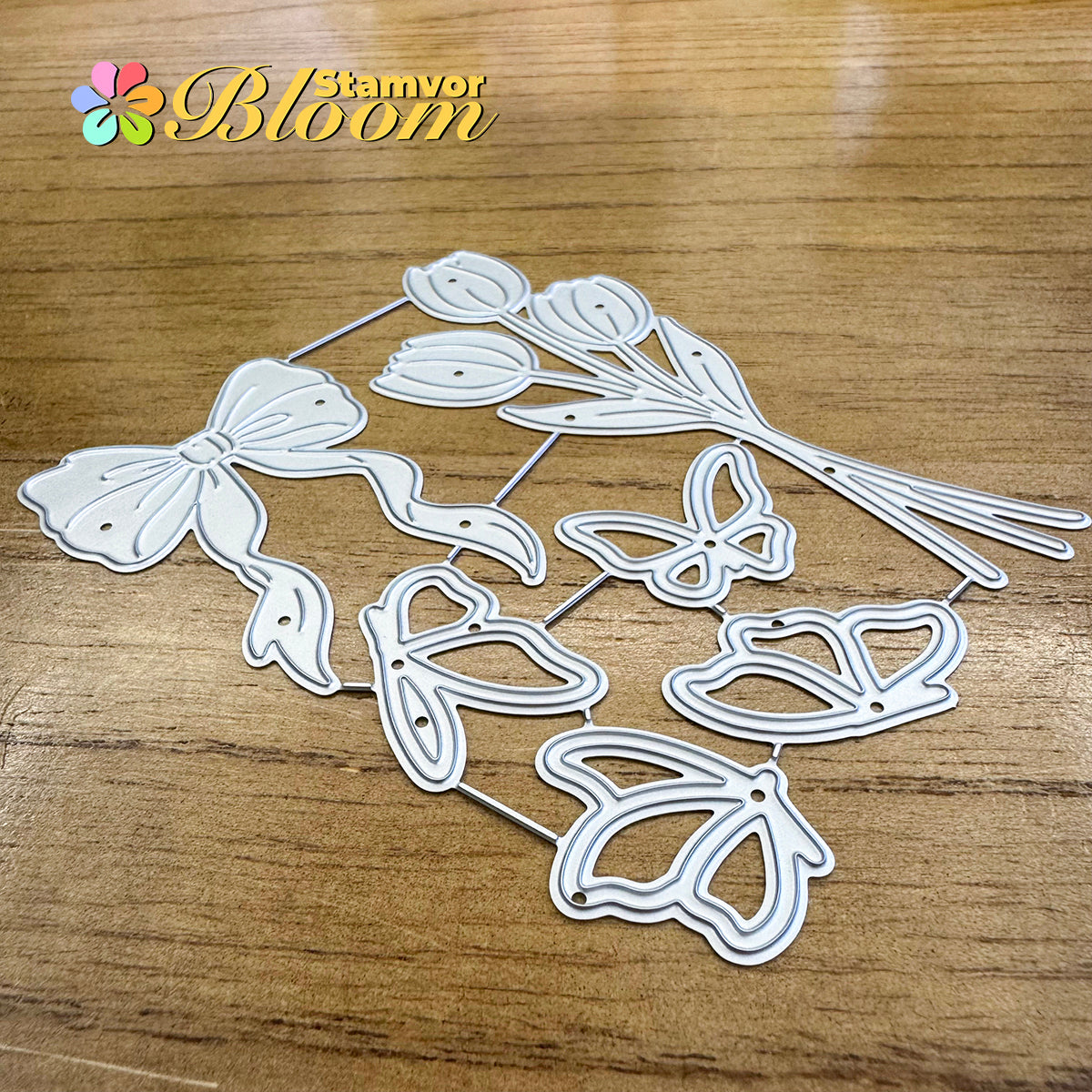 Cutting Dies. This die creates Original Lovely Tulips Flowers Bouquet with Bow and Butterflies, allowing you to show your gratitude in thoughtful cards. With a high-quality steel design, it can cut through most paper, which will help you create beautiful crafts.