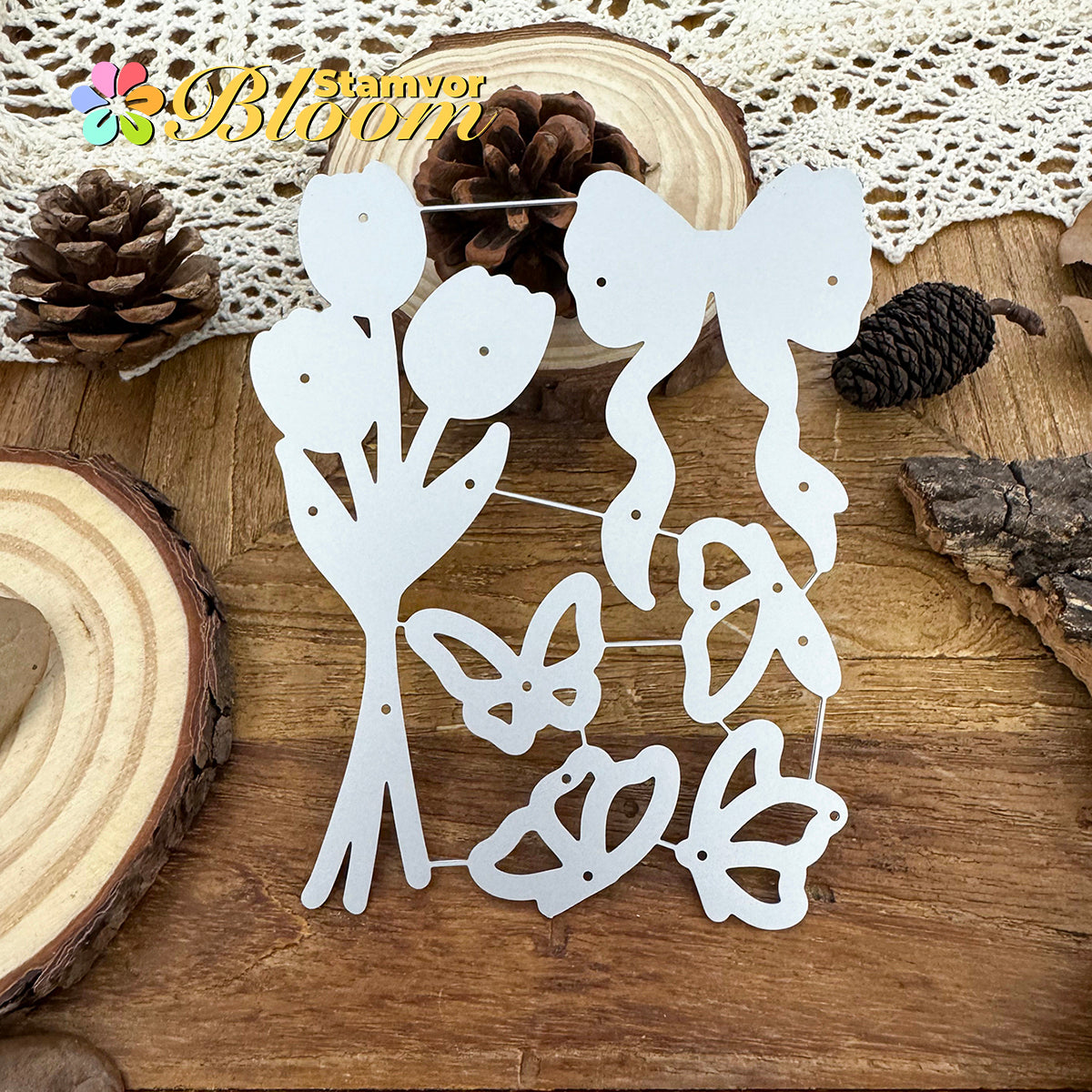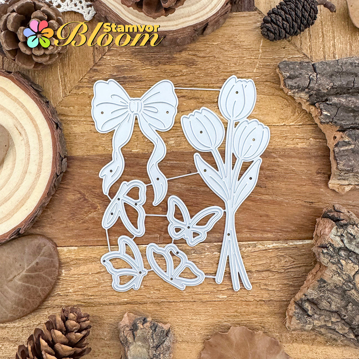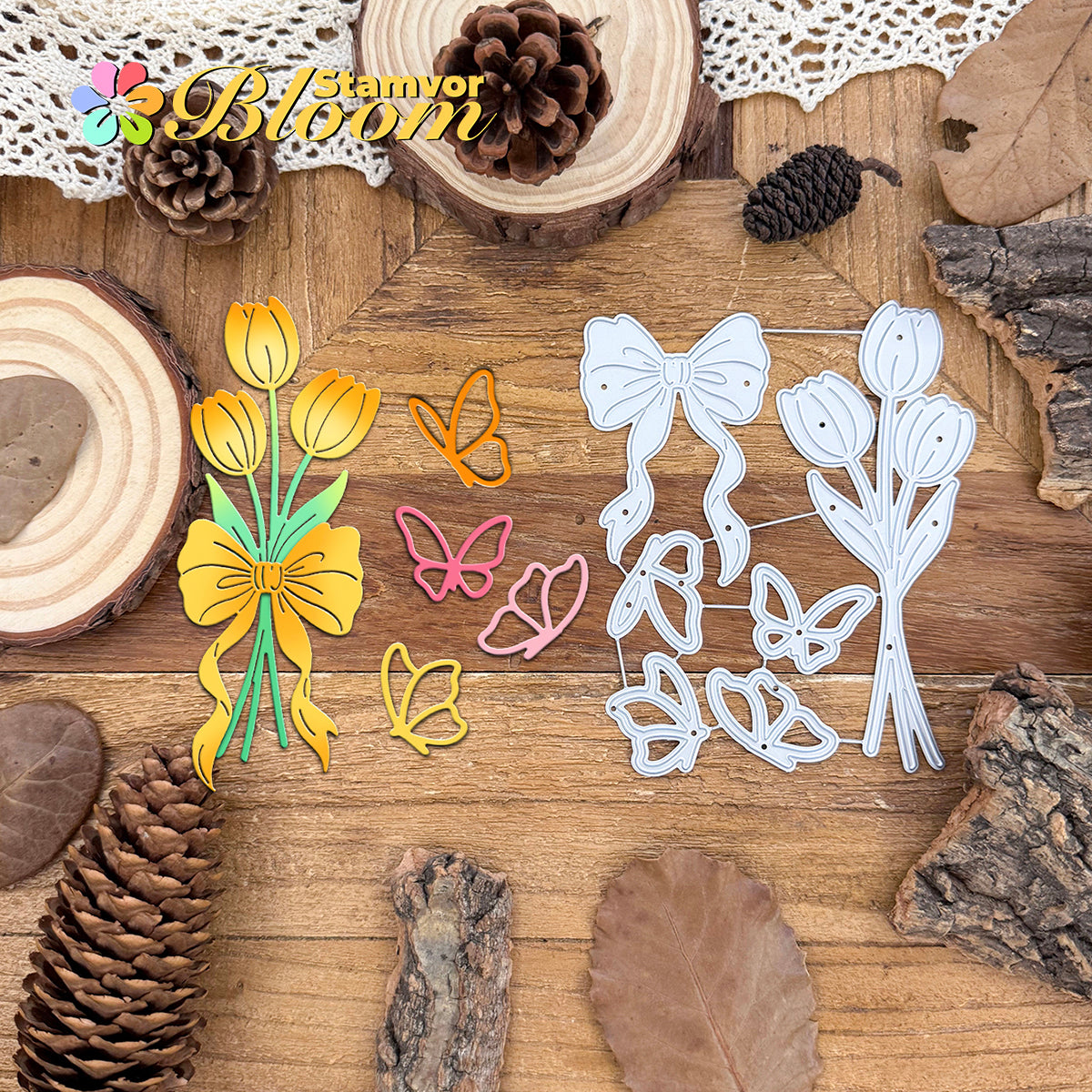 Cutting Dies. This die creates Original Lovely Tulips Flowers Bouquet with Bow and Butterflies, allowing you to show your gratitude in thoughtful cards. With a high-quality steel design, it can cut through most paper, which will help you create beautiful crafts.
